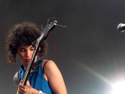 J’arrive sur "the strangers", premier morceau de l’album Actor, tout va bien, je suis apaisé, mais furieusement excité, persuadé que ce concert sera la confirmation que St Vincent est ma préférée. Annie seule au milieu de cette immense scène est fascinante, mon coeur bat la chamade, de bas en haut et de haut en bas, j’observe chaque détail de cette présence angélique : ses cheveux noirs bouclés, son visage fin, ses grands yeux pétillants, sa peau blanche, ses petites tâches sur les joues, son rouge à lèvres, ses ongles dépeints, son chemisier bleu, son pendentif qui s’agite autour de sa nuque émouvante, j’aimerais être son bijou à cet instant.